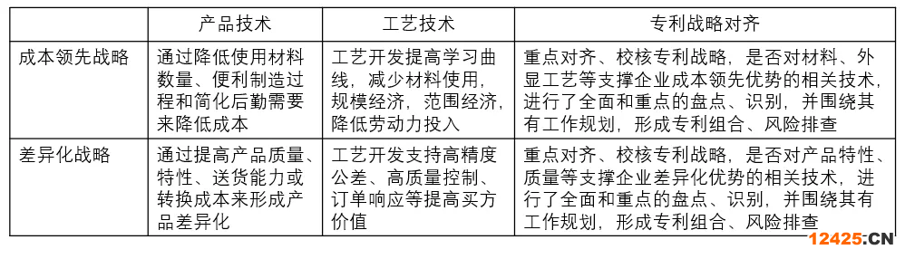 對(duì)于未明確制定或披露企業(yè)戰(zhàn)略的企業(yè),從構(gòu)建競(jìng)爭(zhēng)優(yōu)勢(shì)的角度看,企業(yè)戰(zhàn)略通常以成本領(lǐng)先、差異化和目標(biāo)集聚等方面來(lái)思考。專(zhuān)利戰(zhàn)略和企業(yè)戰(zhàn)略也主要是在構(gòu)建競(jìng)爭(zhēng)優(yōu)勢(shì)這個(gè)基礎(chǔ)上打造,如此使專(zhuān)利戰(zhàn)略能支撐、賦能企業(yè)戰(zhàn)略更好地實(shí)現(xiàn)。換言之,專(zhuān)利戰(zhàn)略支撐企業(yè)戰(zhàn)略,就是要支撐企業(yè)競(jìng)爭(zhēng)優(yōu)勢(shì)的構(gòu)建;專(zhuān)利戰(zhàn)略賦能企業(yè)戰(zhàn)略,就是從專(zhuān)利維度來(lái)構(gòu)建及守護(hù)企業(yè)競(jìng)爭(zhēng)優(yōu)勢(shì)。