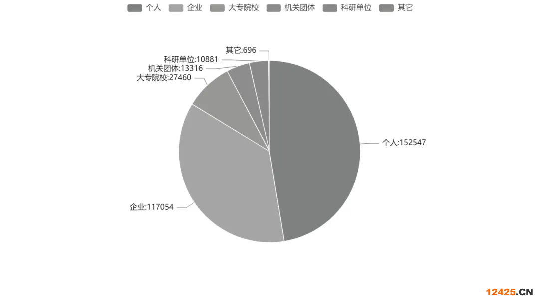 如圖2所示,我國中藥領(lǐng)域的315910件專利申請中,個人專利申請量高達152547件,占比48.3%,個人專利申請人在我國中藥領(lǐng)域?qū)@暾堉凶顬榛钴S,其次是企業(yè)專利申請人,申請量占比37.1%,二者申請量之和已超過85%。相較前二者而言,大專院校和科研單位作為申請人的申請量總共僅占12.1%,反映出我國高校等科研單位在中藥領(lǐng)域申請專利的活躍度不夠。