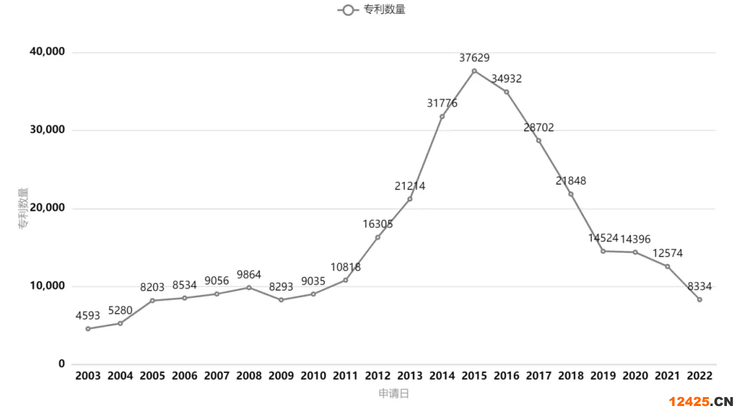 2003年至2022年,我國在中藥領(lǐng)域累計申請專利315910件,其中發(fā)明專利313378件,占比99.2%,實用新型專利2532件,占比0.8%,外觀設(shè)計專利0件,可見發(fā)明專利申請幾乎占據(jù)中藥領(lǐng)域的全部專利申請。每年的申請量情況如圖1所示。
