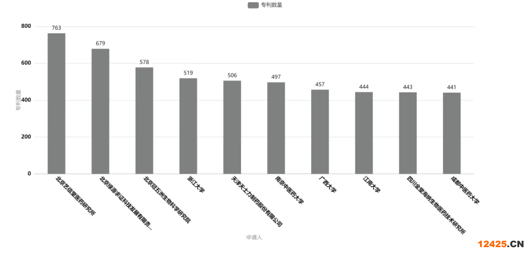 我國中藥領(lǐng)域的個人專利申請量雖然很大,但不同的中藥專利申請由大量不同的個人提出。由圖3可以看出,前10位最活躍的專利申請人均不是個人,而是企業(yè)、高校和科研院所。按申請量統(tǒng)計,北京藝信堂醫(yī)藥研究所等兩家單位居第一檔(600件以上),北京冠五洲生物科學(xué)研究院等三家單位居第二檔(500件以上),南京中醫(yī)藥大學(xué)等4所高校和四川金堂海納生物醫(yī)藥技術(shù)研究所居第三檔(400件以上)。