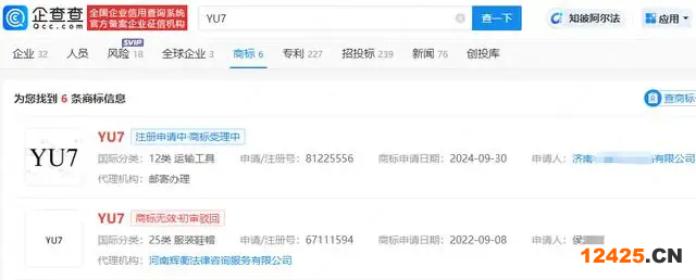 企查查APP顯示,今年9月,濟南某公司曾申請注冊1枚“YU7”商標,國際分類為運輸工具,當前商標狀態(tài)為注冊申請中。此前,曾有自然人侯某某申請注冊“YU7”商標被駁回。