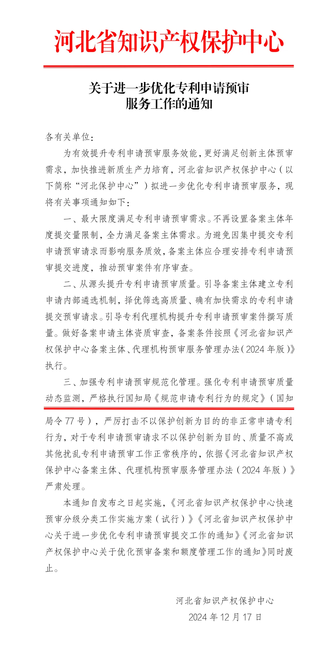 河北省知識(shí)產(chǎn)權(quán)保護(hù)中心發(fā)布了關(guān)于進(jìn)一步優(yōu)化專(zhuān)利申請(qǐng)預(yù)審服務(wù)工作的通知