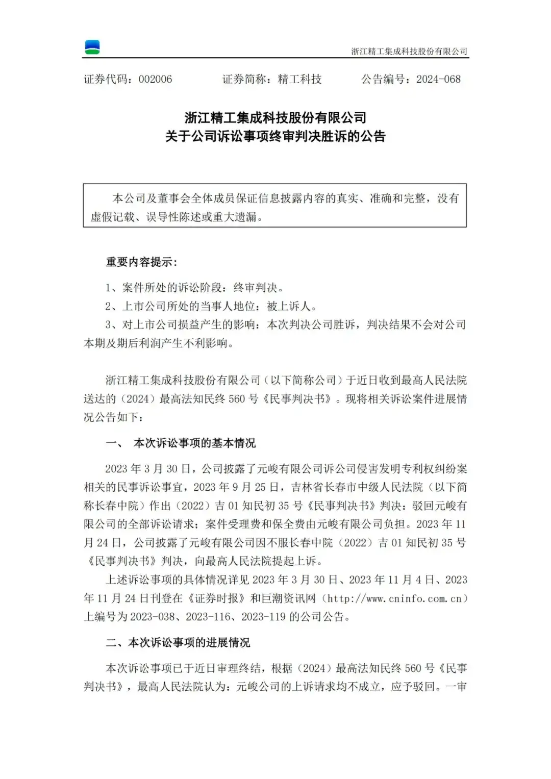 隨后,2023年11月2日,精工科技收到長春中院就該案作出的(2022)吉01知民初35號《民事判決書》,判決駁回元峻公司全部訴訟請求。