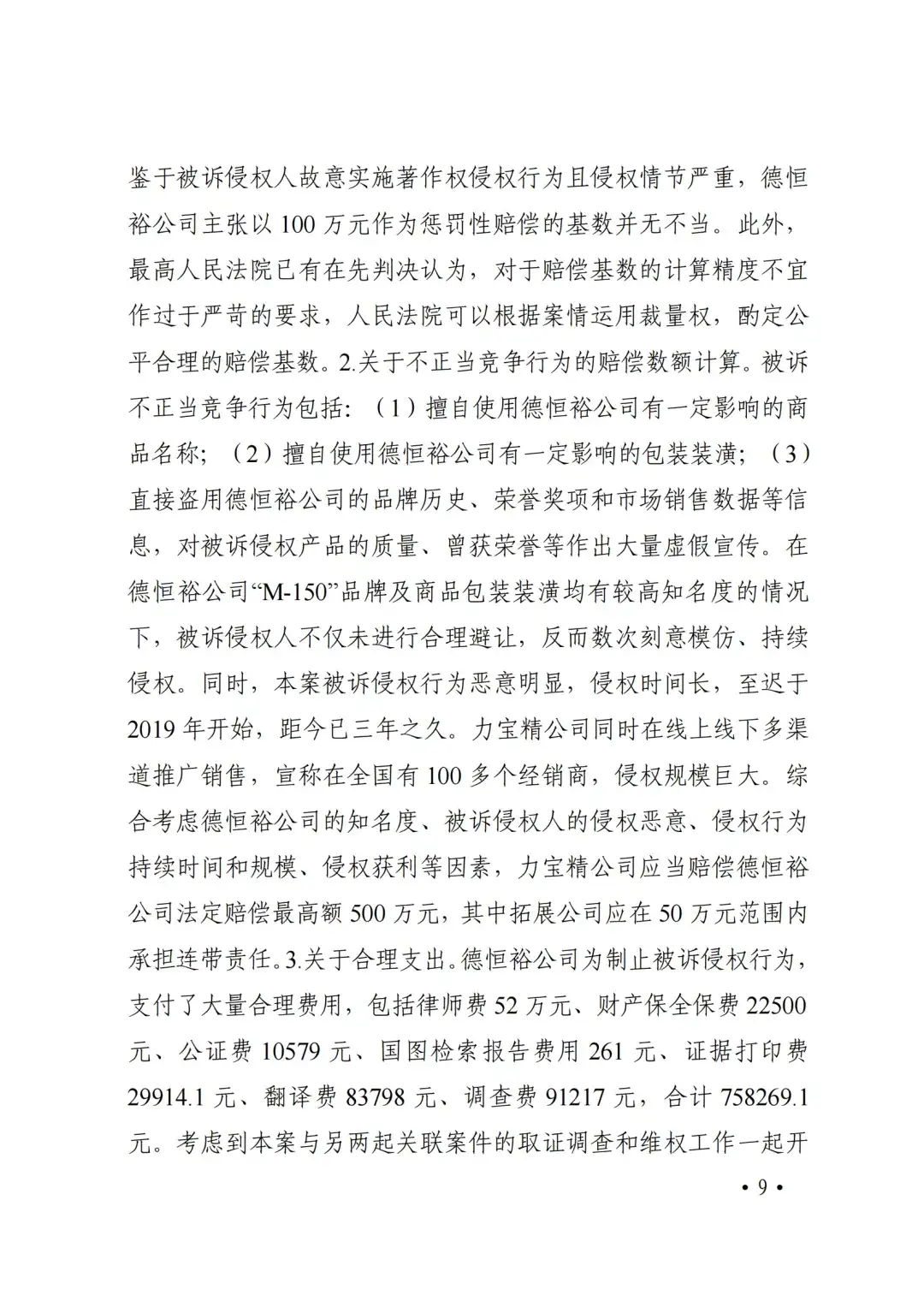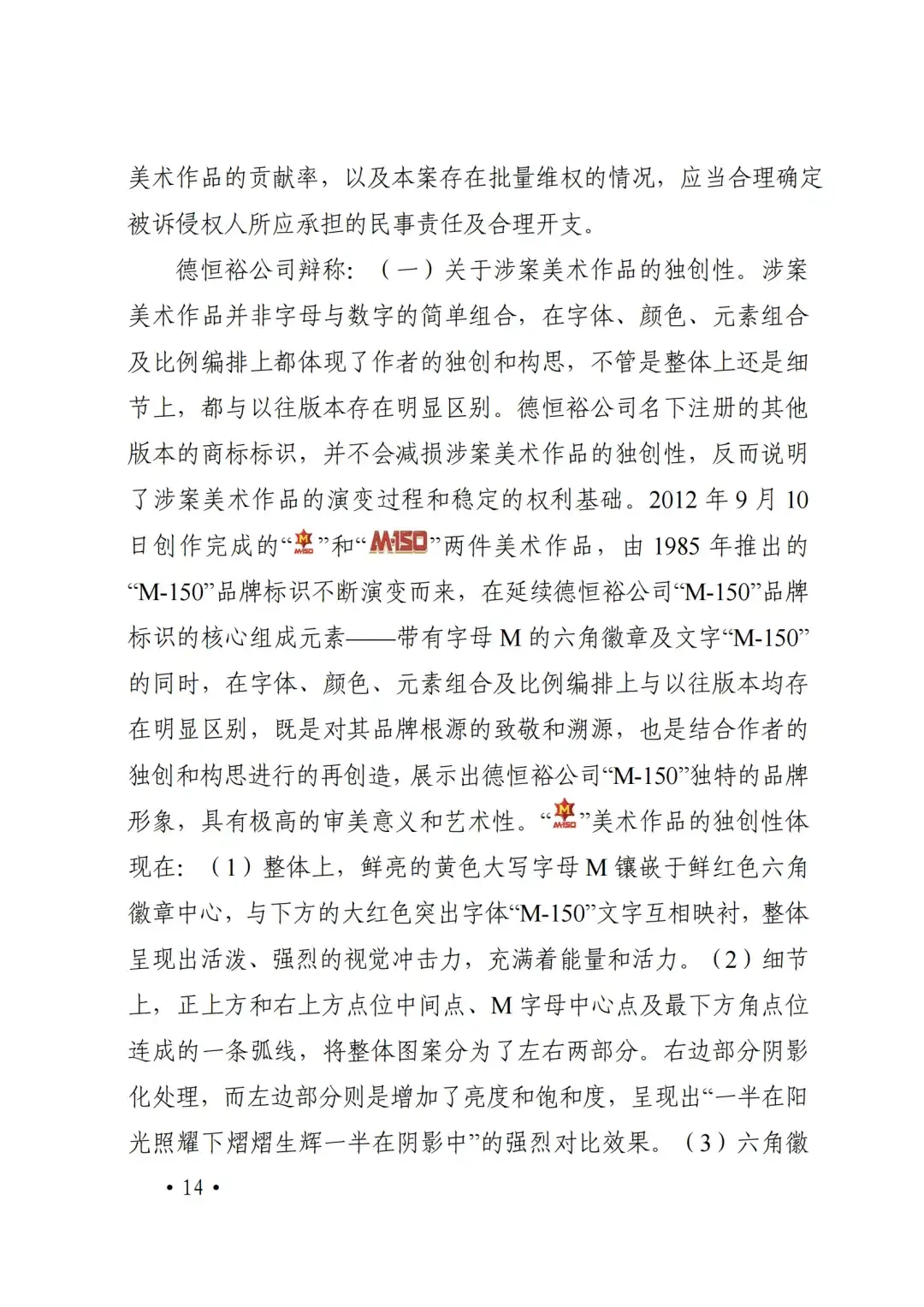 4. 關(guān)于有一定影響的商品名稱和在先注冊商標沖突:在第6345852號“M-150”注冊商標目前依然有效的情況下,德恒裕公司固然不能以“M-150”能量飲料的商品名稱阻礙該商標的權(quán)利人對合法正當使用其注冊商標,但是如果該商標的權(quán)利人對超出自有商標核定使用的商品類別、顯著改變注冊商標的形態(tài),未依法規(guī)范使用注冊商標的,相關(guān)行為仍然可能構(gòu)成不正當競爭。本案中,在力寶精公司突破自身權(quán)利邊界,已經(jīng)構(gòu)成違法行為的情況下,認定其行為構(gòu)成不正當競爭并不會導(dǎo)致合法權(quán)利之間的沖突問題。
