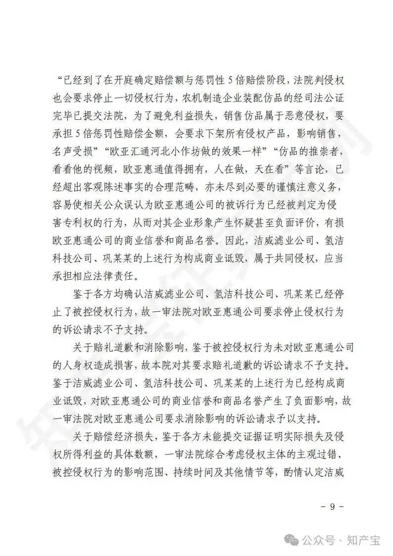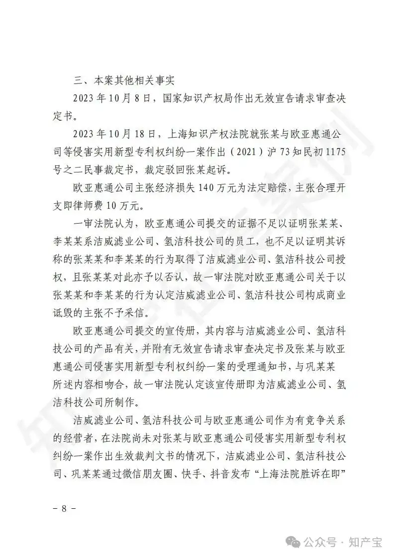 一、潔威濾業(yè)公司、氫潔科技公司、鞏某某于判決生效之日起十日內(nèi)于快手和抖音平臺(tái)上連續(xù)三天刊登聲明,就本案商業(yè)詆毀行為為歐亞惠通公司消除影響;二、潔威濾業(yè)公司、氫潔科技公司、鞏某某于判決生效之日起十日內(nèi)賠償歐亞惠通公司經(jīng)濟(jì)損失 3 萬元;三、潔威濾業(yè)公司、氫潔科技公司、鞏某某于判決生效之日起十日內(nèi)賠償歐亞惠通公司合理支出 1 萬元;四、駁回歐亞惠通公司的其他訴訟請(qǐng)求。