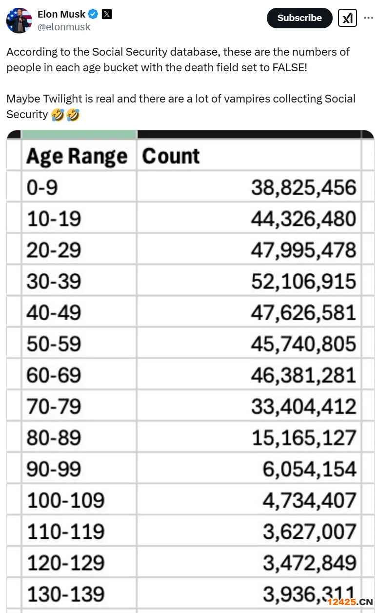 特斯拉CEO埃隆·馬斯克在社交媒體X上拋出一枚“重磅炸彈”——美國社會保障系統(tǒng)疑似存在史上最大規(guī)模欺詐行為:超3.94億人領(lǐng)取社保,超美國3.34億總?cè)丝?其中百歲以上老人竟超過2000萬,甚至有人年齡高達360歲,這遠遠早于美國建國歷史(1776年)。