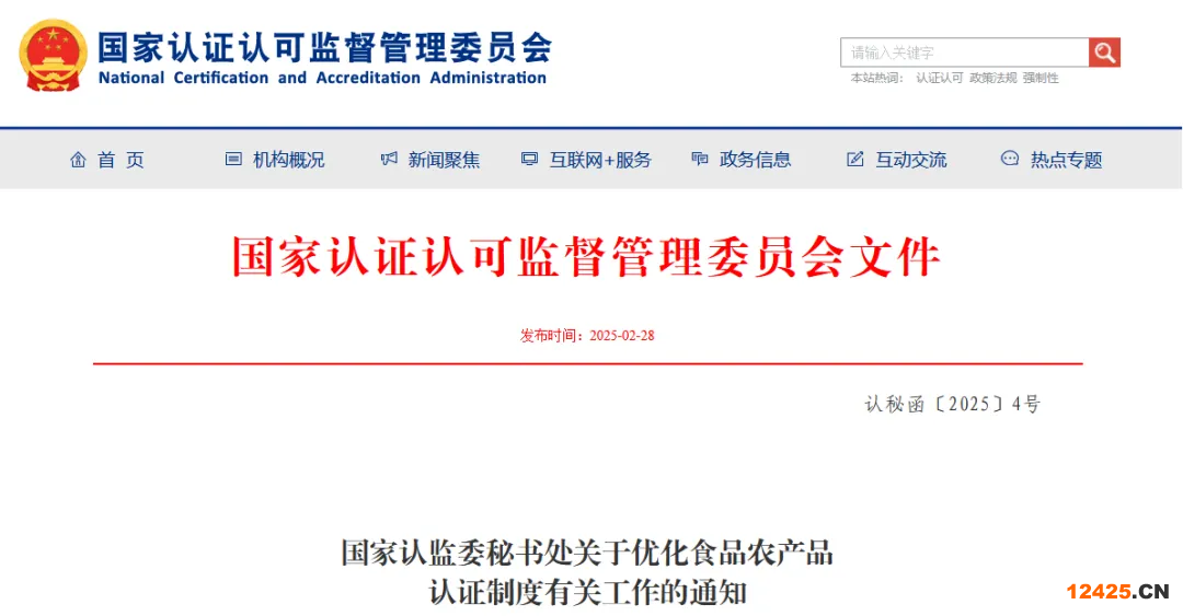 為貫徹落實(shí)黨的二十屆三中全會、中央經(jīng)濟(jì)工作會議和《中共中央 國務(wù)院關(guān)于進(jìn)一步深化農(nóng)村改革 扎實(shí)推進(jìn)鄉(xiāng)村全面振興的意見》精神,按照2025年全國認(rèn)證認(rèn)可檢驗(yàn)檢測工作會議部署,發(fā)揮食品農(nóng)產(chǎn)品認(rèn)證助推食品農(nóng)產(chǎn)品質(zhì)量提升、提振消費(fèi)的積極作用,現(xiàn)就進(jìn)一步優(yōu)化食品農(nóng)產(chǎn)品認(rèn)證制度相關(guān)工作通知如下。