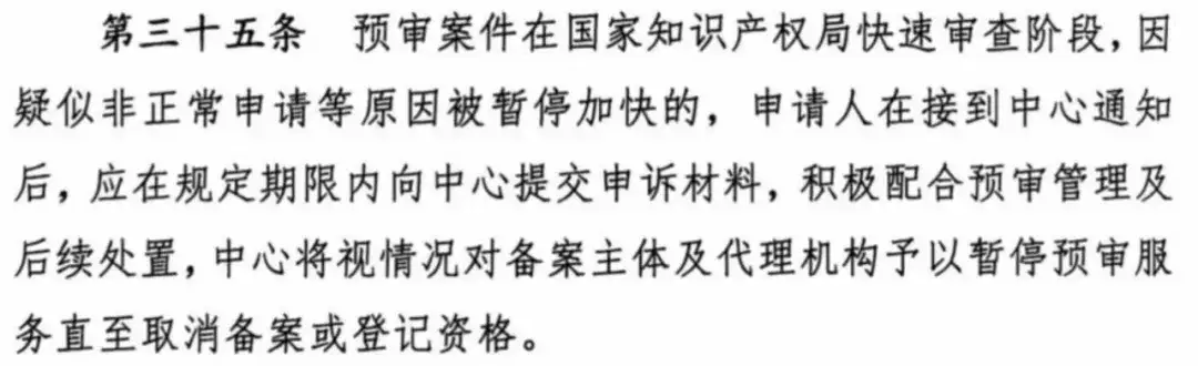 據(jù)《遼寧省知識產權保護中心備案主體及代理機構預審服務管理辦法(試行)》第三十五條顯示,預審案件在國家知識產權局快速審查階段,因疑似非正常申請等原因被暫停加快的,申請人在接到中心通知后,應在規(guī)定期限內向中心提交申訴材料,積極配合預審管理及后續(xù)處置,中心將視情況對備案主體及代理機構予以暫停預審服務直至取消備案或登記資格。