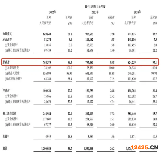 招股書顯示,2022年-2024年,上述服務(wù)費(fèi)創(chuàng)造的收入占公司總收入的比例分別為25.7%、16.2%及14.8%。盡管收入占比較少,但得益于接近100%的毛利率,服務(wù)費(fèi)成了周六福利潤(rùn)的核心支柱。