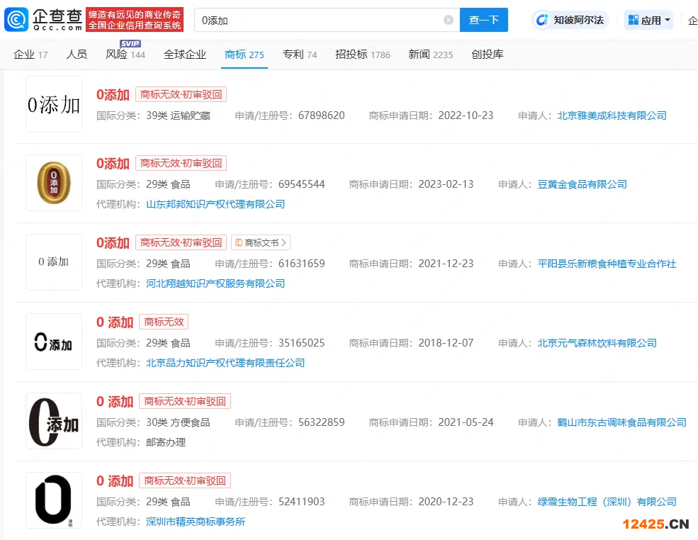 企查查顯示,此前曾有多家公司申請注冊“0添加”“零添加”商標(biāo),國際分類涉及運(yùn)輸貯藏、食品、方便食品等,目前大多被駁回,處無效狀態(tài)。