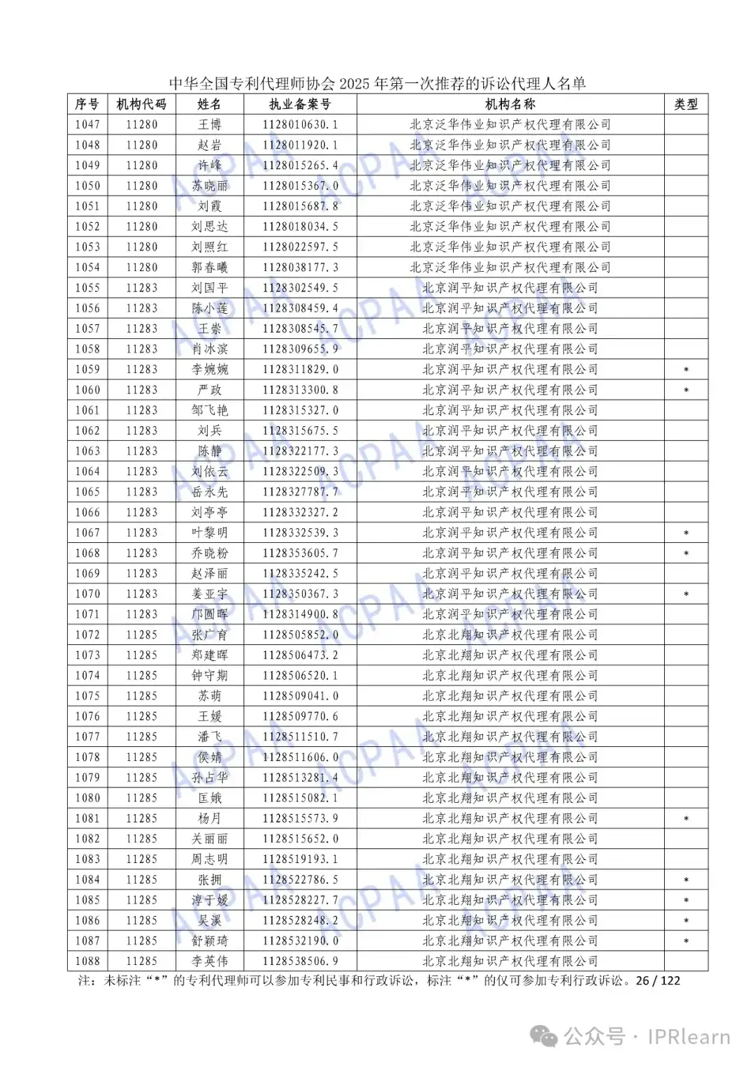 中華全國專利代理師協(xié)會公布2025年第一次推薦的訴訟代理人名單