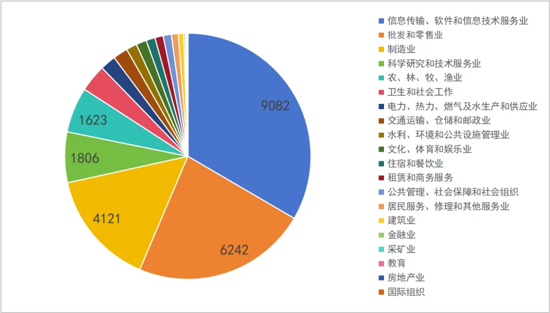 申請數(shù)據(jù)知識產(chǎn)權(quán)登記的產(chǎn)業(yè)覆蓋農(nóng)、林、牧、漁業(yè)等所有20個行業(yè)門類,排名靠前的有:信息傳輸、軟件和信息技術(shù)服務(wù)業(yè)(占33.42%),批發(fā)和零售業(yè)(占22.97%),制造業(yè)(占15.16%),科學(xué)研究和技術(shù)服務(wù)業(yè)(占6.64%),農(nóng)、林、牧、漁業(yè)(占5.97%)。