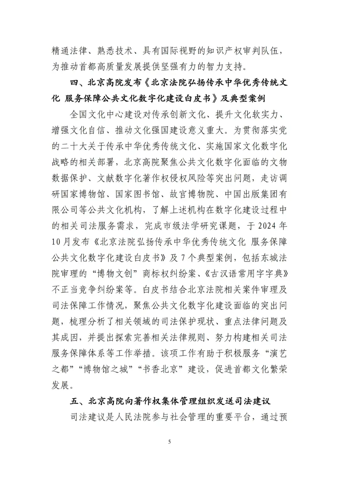 其中,《北京市高級人民法院為加快建設(shè)全球數(shù)字經(jīng)濟標(biāo)桿城市提供司法保障工作規(guī)劃(2023-2025)》結(jié)合數(shù)字經(jīng)濟重點領(lǐng)域的產(chǎn)業(yè)特點,從信創(chuàng)、數(shù)據(jù)、互聯(lián)網(wǎng)3.0及信創(chuàng)的應(yīng)用場景等四個方面分領(lǐng)域細化了相關(guān)對接舉措;《關(guān)于完善數(shù)字經(jīng)濟下新型不正當(dāng)競爭案件審理機制調(diào)研報告》針對數(shù)字經(jīng)濟下新型不正當(dāng)競爭案件的審理機制提出改進思路,積極引導(dǎo)平臺經(jīng)濟向開放、創(chuàng)新、賦能方向發(fā)展;向著作權(quán)集體管理組織發(fā)送的司法建議聚焦依法履行著作權(quán)集體管理職責(zé)要求、完善著作權(quán)許可使用費管理制度、充分發(fā)揮自身職能作用等方面,有效推動社會管理漏洞的修補和法律風(fēng)險的防范;與國家知識產(chǎn)權(quán)局聯(lián)合召開的商標(biāo)司法行政協(xié)同保護座談會就推動糾紛實質(zhì)化解等多方面問題達成共識,通過優(yōu)化商標(biāo)注冊與保護秩序為首都高質(zhì)量發(fā)展和助推品牌強國建設(shè)提供有力司法保障;完善三級法院共享技術(shù)調(diào)查官制度,創(chuàng)設(shè)“院士領(lǐng)航”專家智庫體系,有效輔助法官破解技術(shù)難題,指引矛盾糾紛科學(xué)有效化解;全市三級法院先后成立8家知識產(chǎn)權(quán)巡回審判庭,實現(xiàn)重點科技園區(qū)巡回審判和司法服務(wù)全覆蓋,形成服務(wù)于北京“三城一區(qū)”的巡回審判特色發(fā)展格局。此外,北京法院還發(fā)布了《北京法院知識產(chǎn)權(quán)專業(yè)化審判三十年白皮書(1993-2023)》(中英文版)、《北京法院弘揚傳承中華優(yōu)秀傳統(tǒng)文化 服務(wù)保障公共文化數(shù)字化建設(shè)白皮書》、《北京市高級人民法院關(guān)于侵害知識產(chǎn)權(quán)民事案件適用懲罰性賠償審理指南》、《北京知識產(chǎn)權(quán)法院十年審判工作白皮書(2014—2024)》以及相關(guān)典型案例,凝結(jié)了北京法院知識產(chǎn)權(quán)審判隊伍銳意進取的智慧結(jié)晶和服務(wù)大局的責(zé)任擔(dān)當(dāng)。