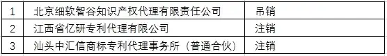 北京細軟智谷知識產(chǎn)權(quán)代理有限責(zé)任公司營業(yè)執(zhí)照被吊銷,江西省億研專利代理有限公司等2家代理機構(gòu)經(jīng)營狀態(tài)為注銷,不再符合注冊登記申請的有關(guān)條件,即日起取消其專利申請預(yù)審服務(wù)登記代理機構(gòu)資格。