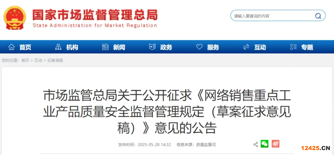為加強(qiáng)網(wǎng)絡(luò)銷售重點(diǎn)工業(yè)產(chǎn)品質(zhì)量安全監(jiān)管,明確重點(diǎn)產(chǎn)品電子商務(wù)經(jīng)營(yíng)者質(zhì)量安全責(zé)任和義務(wù),保障重點(diǎn)產(chǎn)品質(zhì)量安全,保護(hù)消費(fèi)者權(quán)益,市場(chǎng)監(jiān)管總局研究制定了《網(wǎng)絡(luò)銷售重點(diǎn)工業(yè)產(chǎn)品質(zhì)量安全監(jiān)督管理規(guī)定(草案征求意見(jiàn)稿)》,現(xiàn)向社會(huì)公開(kāi)征求意見(jiàn)。意見(jiàn)反饋截止日期為2025年6月28日。