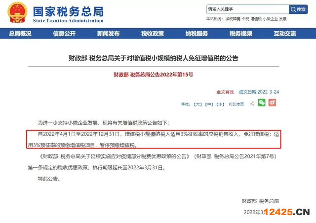 財(cái)政部、稅務(wù)總局聯(lián)合制發(fā)了《財(cái)政部稅務(wù)總局關(guān)于對增值稅小規(guī)模納稅人免征增值稅的公告》(2022年第15號,以下簡稱“15號公告”),明確自2022年4月1日至2022年12月31日,增值稅小規(guī)模納稅人適用3%征收率的應(yīng)稅銷售收入,免征增值稅。