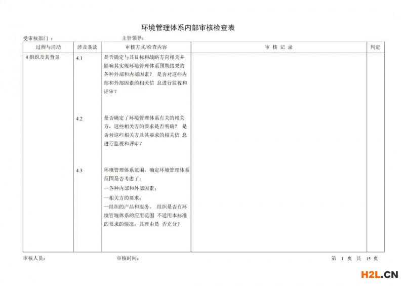 環(huán)境管理體系ISO14001:2015內(nèi)審檢查表(按條款)!