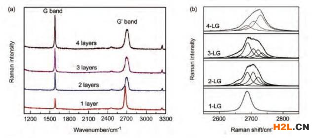 圖2 (a)1,2,3,4層石墨烯的拉曼光譜;(b)1~4層石墨烯的拉曼G'峰 [1,2]