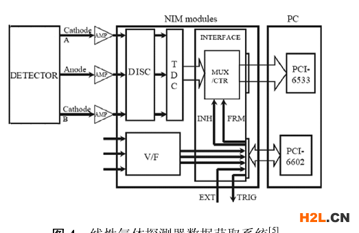 氣體探測器將測到的X射線散射信號轉(zhuǎn)換成電荷脈沖信號,經(jīng)前置放大器(AMP)放大后,再經(jīng)甄別器(DISC)對每個脈沖信號進行甄別,即過濾掉振幅小于域值的脈沖信號,并將有效脈沖信號轉(zhuǎn)換為標(biāo)準(zhǔn) NIM 信號。標(biāo)準(zhǔn) NIM 信號經(jīng)時間-數(shù)字轉(zhuǎn)換器(TDC)轉(zhuǎn)換成位置數(shù)字信號。多路器(MUX/CTR)將位置信號及脈沖計數(shù)結(jié)合再通過 PCI-6533 計數(shù)卡送到顯示器。