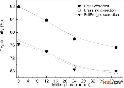 圖三所示為結(jié)晶度隨著球磨時(shí)間的增加而發(fā)生的變化。運(yùn)用Jade軟件計(jì)算SrFe12O19與金剛石的質(zhì)量分?jǐn)?shù),并根據(jù)公式: