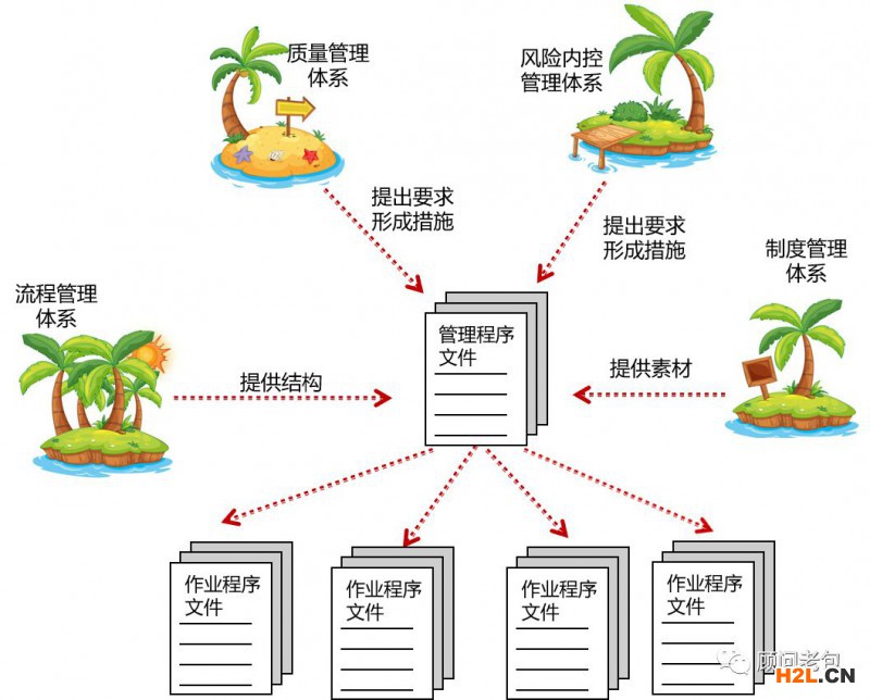 最終我們應(yīng)該形成這樣的一個(gè)結(jié)果:所有的管理體系、制度和流程都整合在一套文件中。這套文件的特征是:第一,它是完整的,能夠覆蓋所有的業(yè)務(wù)功能,沒(méi)有什么被遺漏,也沒(méi)有什么重疊;第二,它是結(jié)構(gòu)化的,從宏觀到細(xì)節(jié),能滿(mǎn)足各個(gè)層次、多個(gè)專(zhuān)業(yè)的管理和操作需要;第三,它是唯一的,所有相關(guān)的專(zhuān)業(yè)共同來(lái)維護(hù),他們可以從中提取他們需要的內(nèi)容和信息,但不是制造出另外一份不同的文件。