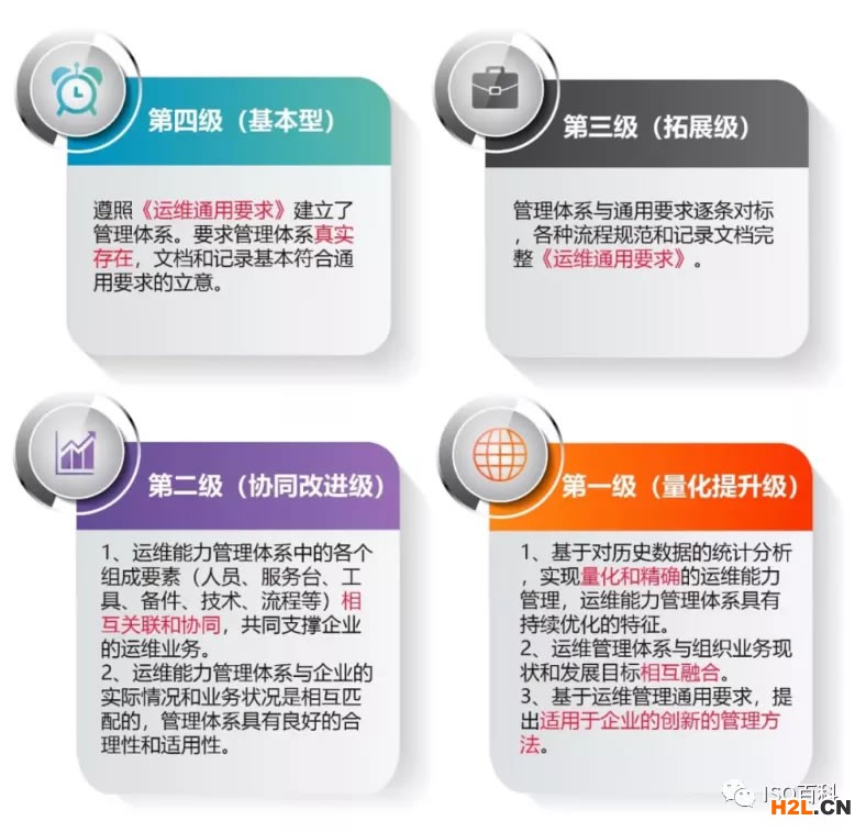 ITSS能力成熟度模型包括基本型,拓展級,改進(jìn)級和提升級四個(gè)等級,從低到高分別用四、三、二、一表示。