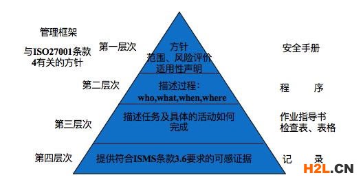 ISO27001 標準要求的ISMS 文件體系應(yīng)該是一個層次化的體系,通常是由四個層次構(gòu)成的: