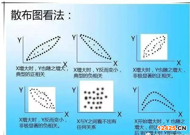 在分析獨立數(shù)據(jù)時,用直方圖、柏拉圖就可找出改善著眼點,但如要解析兩個變量X、Y之間的相關(guān)性時,就需使用散布圖,將X與Y的兩組數(shù)據(jù)繪在方格紙上,可看出X、Y之間相關(guān)情形的圖謂之散布圖。