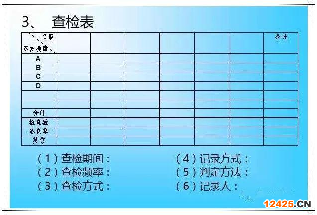 在品管圈改善活動,為了便于收集數(shù)據(jù)與解析判斷,而設(shè)計的一種表格,查檢表。