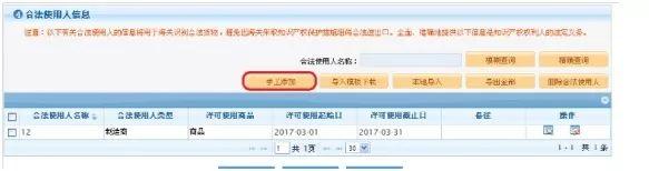 上圖的“合法使用人”信息的欄目主要用于填寫經(jīng)授權(quán)的合法使用人信息,便于海關(guān)在監(jiān)管工作中判斷相關(guān)貨物的進(jìn)出口主體是否合法,紅框部分為幾種添加方式,根據(jù)自己的需要導(dǎo)入合法使用人信息即可。