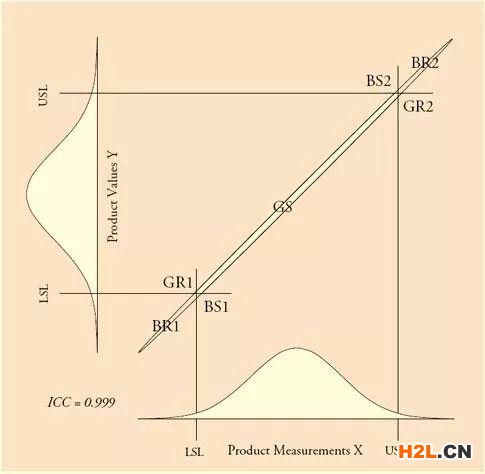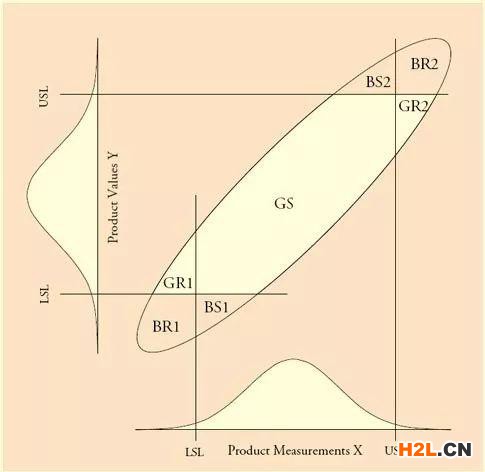 第一種辦法:堅持100%檢驗(yàn),那么就要改進(jìn)測量系統(tǒng),使得雙變量正態(tài)分布中的橢圓扁到像一條直線一樣,這時PGS與PBR都會非常高。