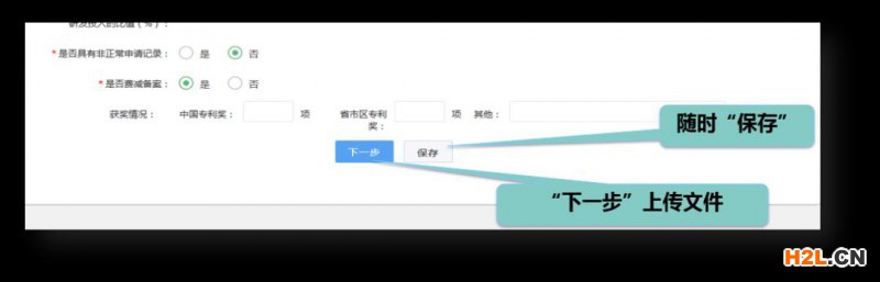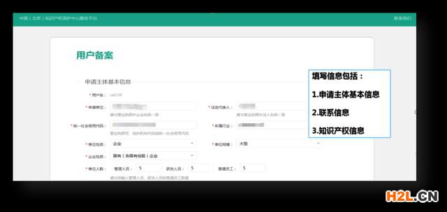 2、通過【用戶備案】模塊,填寫申請主體基本信息、聯(lián)系信息、知識產權信息等(除代理機構聯(lián)系人及聯(lián)系方式外,其它均需填寫,如申請主體沒有新產品發(fā)布等情況,該項可填寫“0”或“無”),點選“下一步”進入“資質文件上傳”界面,如尚未填寫完整,可點選保存,下次登錄繼續(xù)填寫。