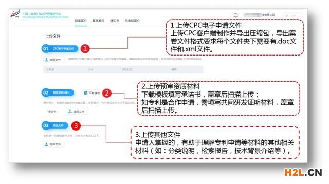 在首頁【專利申請】模塊,通過【預審案件】→【新建案件】,根據提示要求,上傳“CPC電子申請文件”(XML格式)、“預審資質文件”(下載模板填寫)及其他文件(非必交項),并填寫所屬領域及專利分類號等信息后提交審核。