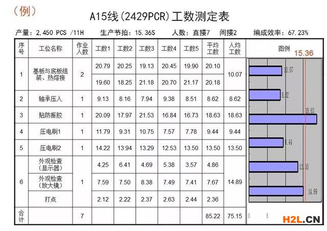 ⑤做成生產線整體的工數(shù)測定表,計算出各工位的平均工數(shù)和人均工數(shù),并用平衡圖表示。