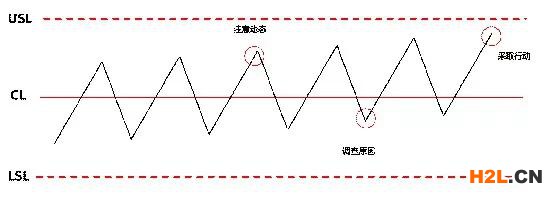 在完成過(guò)程分析后,若判定過(guò)程穩(wěn)定且過(guò)程能力可接受,那么,就進(jìn)入控制狀態(tài)(先將控制線畫(huà)在控制圖中,然后依抽樣的結(jié)果在控制圖上進(jìn)行描點(diǎn)監(jiān)控),此時(shí)控制圖的控制線,是過(guò)程分析改進(jìn)、判定完成后,最終的分析數(shù)據(jù)控制線延長(zhǎng),用于過(guò)程控制的。