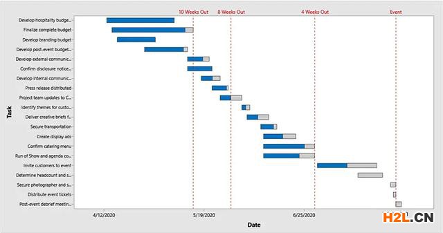 當每個人都使用標準的甘特圖模板(例如Minitab Workspace中的版本)時,溝通甚至會更加強大。甘特圖也非常適合與高管和利益相關者交流高級計劃和狀態(tài)更新,而任務甘特圖(如下所示)則更好地顯示和與工作團隊更詳細地交流工作進度。