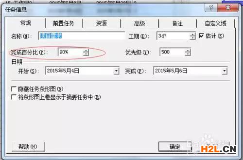 如下截圖1,雙擊標紅框中的任意區(qū)域,會出現圖2,在圖2 的標紅中,填寫上“完成百分比”,點擊確定就可以了。這時候你就會發(fā)現右邊的甘特圖發(fā)生如下圖3的變化。