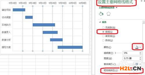 雙擊網格線 - 設置主要網格線格式 - 實線 - 顏色 - 短劃線類型(短劃線)。