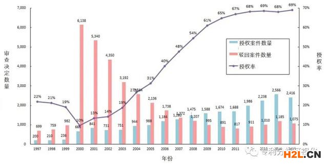 授權(quán)率=授權(quán)專利的決定數(shù)/(授權(quán)專利的決定數(shù)+駁回決定的數(shù)量+最后一次通知書后撤回或放棄的數(shù)量)