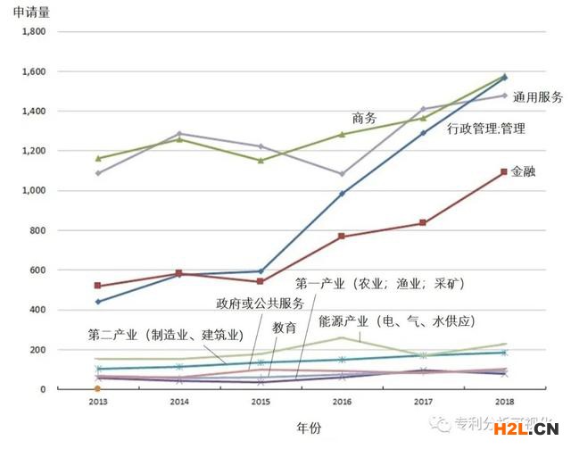 盡管涉及第一和第二產(chǎn)業(yè)相關(guān)的申請數(shù)量很少,但從2013年到2018年,這一數(shù)字翻了一番,可以看出,利用信息和通信技術(shù)解決問題的方法已經(jīng)擴展到了廣泛的領域。