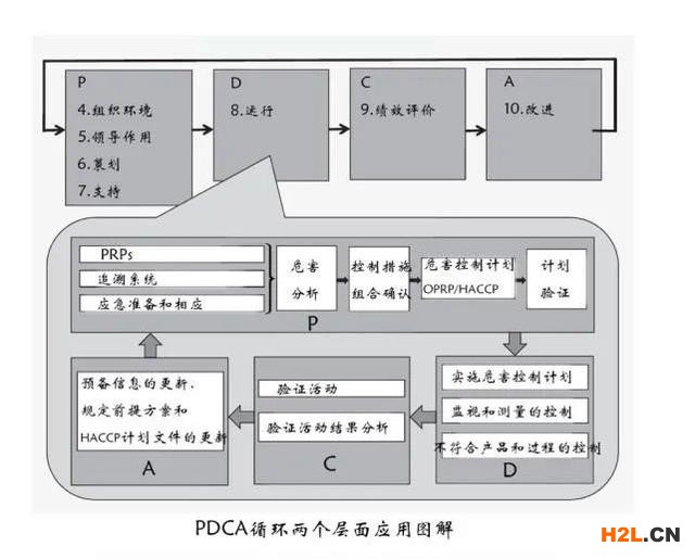 “0.3  過程方法”中指出,ISO 22000:2018在兩個(gè)層面運(yùn)用PDCA循環(huán),一是在整個(gè)體系所有章節(jié)(第四章至第十章)中運(yùn)用;另一個(gè)是在第八章中運(yùn)用,如圖: