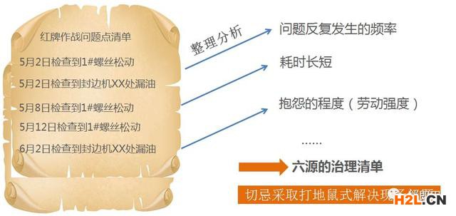 六源的查找不是坐在辦公室里面想出來,或者來個(gè)頭腦風(fēng)暴法討論出來的,必須到現(xiàn)場去,觀察現(xiàn)物,了解現(xiàn)實(shí);唯一的方法就是通過反復(fù)的清掃及紅牌作戰(zhàn)找出發(fā)生源和困難源。