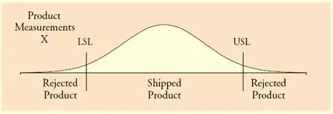 產(chǎn)品的合格標準已知,上下限的規(guī)格值也已經(jīng)給出,如上圖的LSL與USL。在LSL與USL之間的產(chǎn)品將是合格產(chǎn)品。