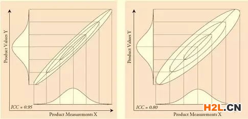 該分布的概率模型可以在XY坐標平面中由一系列橢圓表示,下圖顯示了兩個雙變量正態(tài)分布的一,二和三標準偏差等值線,其中組內(nèi)相關(guān)系數(shù)分別為設(shè)定為0.95和0.80。