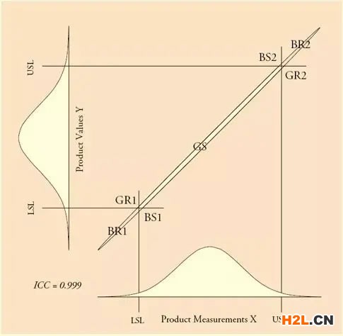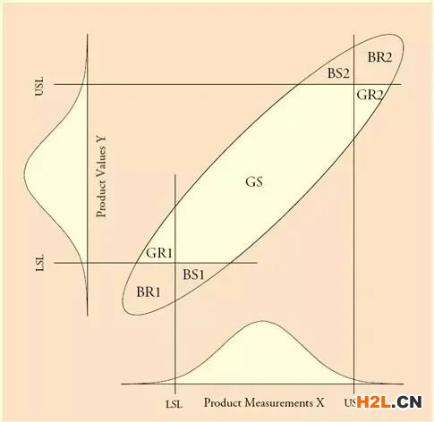 第一種辦法:堅持100%檢驗,那么就要改進測量系統(tǒng),使得雙變量正態(tài)分布中的橢圓扁到像一條直線一樣,這時PGS與PBR都會非常高。