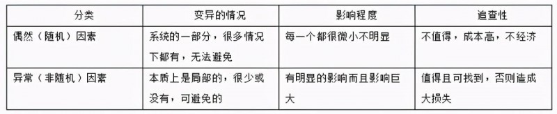 在工作過程中,工作質量會受各種因素的影響而產生變動。而引起變動的原因可分為兩種,一種為偶然(隨機)因素,一種為異常(非隨機)因素。偶然因素是大量地客觀存在的,是過程所固有的,但對過程質特性的影響很小,是人們無法加以消除的。異常因素不是過程所固有的,但對過程質量特性的影響較大,查明原因后,是可以消除的。