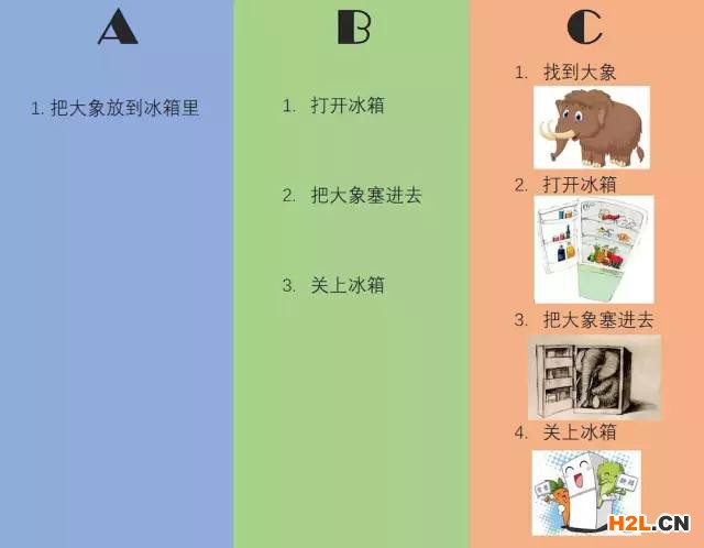 先讓我們隨手舉個例子來理解一下 SOP ,比如我們要寫一個「把大象放到冰箱里」的流程: