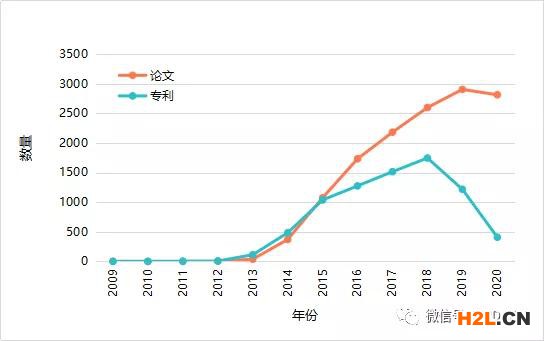 使用歐專局專利數(shù)據(jù)庫(Espacenet)和棱鏡數(shù)據(jù)庫(Lens.com)對涉及鈣鈦礦光伏技術(shù)的專利申請和期刊論文進行了檢索和分析,共檢索到7800多件專利申請和13700多篇期刊論文(檢索日期截止至2020-12-10)。圖2示出了鈣鈦礦光伏技術(shù)的論文發(fā)表量和專利申請量隨時間變化的曲線。基于該曲線,可以將鈣鈦礦光伏技術(shù)的發(fā)展分為三個階段: