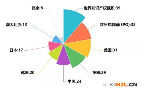 圖8示出了Oxford PV公司的全球?qū)@季智闆r。如圖所示,Oxford PV公司向WIPO提交的申請(PCT申請)的數(shù)量最多,這說明該公司特別注重研發(fā)成果的全球化保護,幾乎每項發(fā)明創(chuàng)造都提交了PCT申請。在具體國家/地區(qū)排名方面,Oxford PV公司提交的申請主要集中在歐專局、美國、英國、中國、韓國、日本和澳大利亞等國家/地區(qū)。