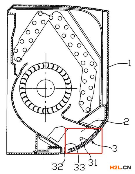 具體技術方案如下圖所示,圖中:2為導風架、3為導風門,導風門位于空調器室內機的出風口處、31為外面板、32為里面板。